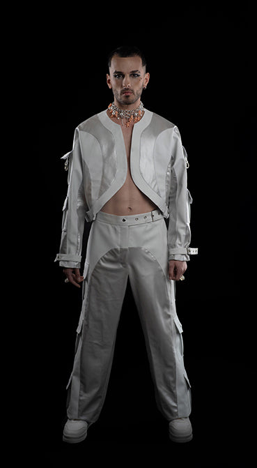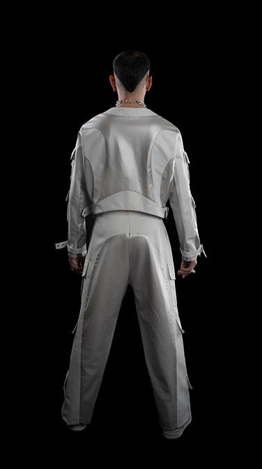 Pantalón en polipiel combinada plata y blanco. 6 bolsillos laterales con cierre a presión. Cierre en delantero cruzado con hebilla en lateral.