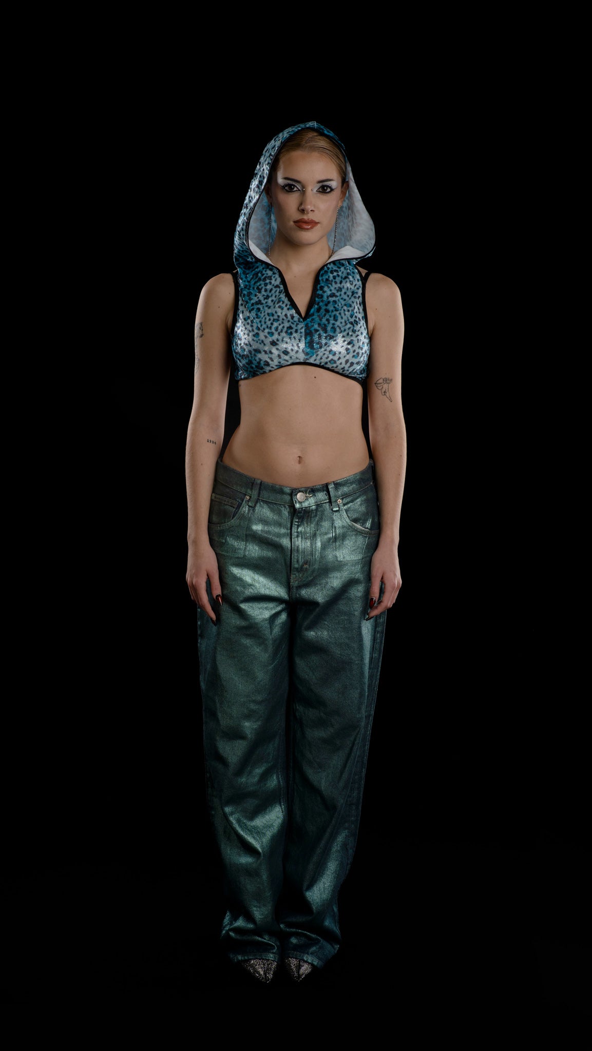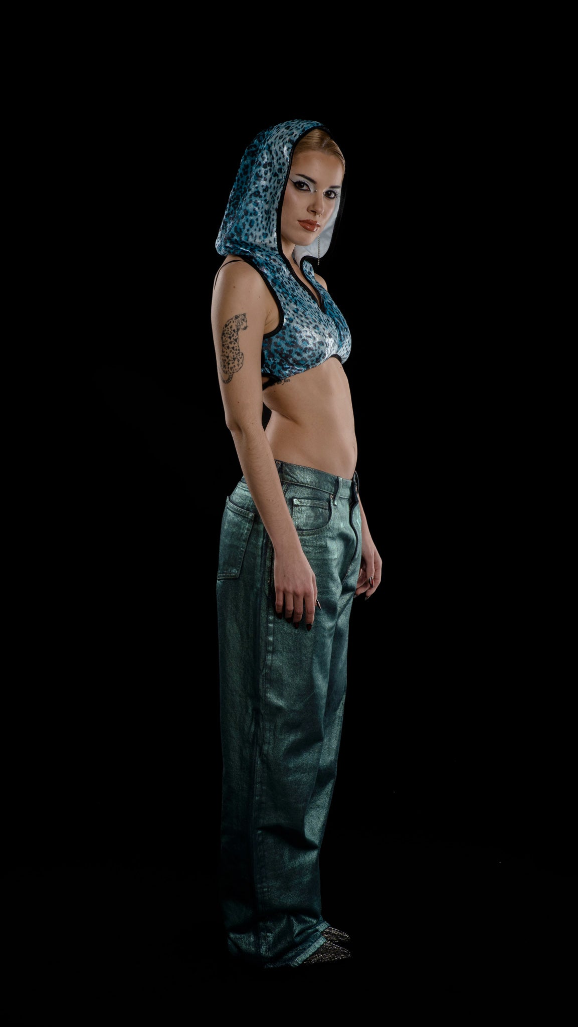 Top en tejido elástico metalizado con animal print de leopardo. Top con capucha y escote en V. Escote en espalda.