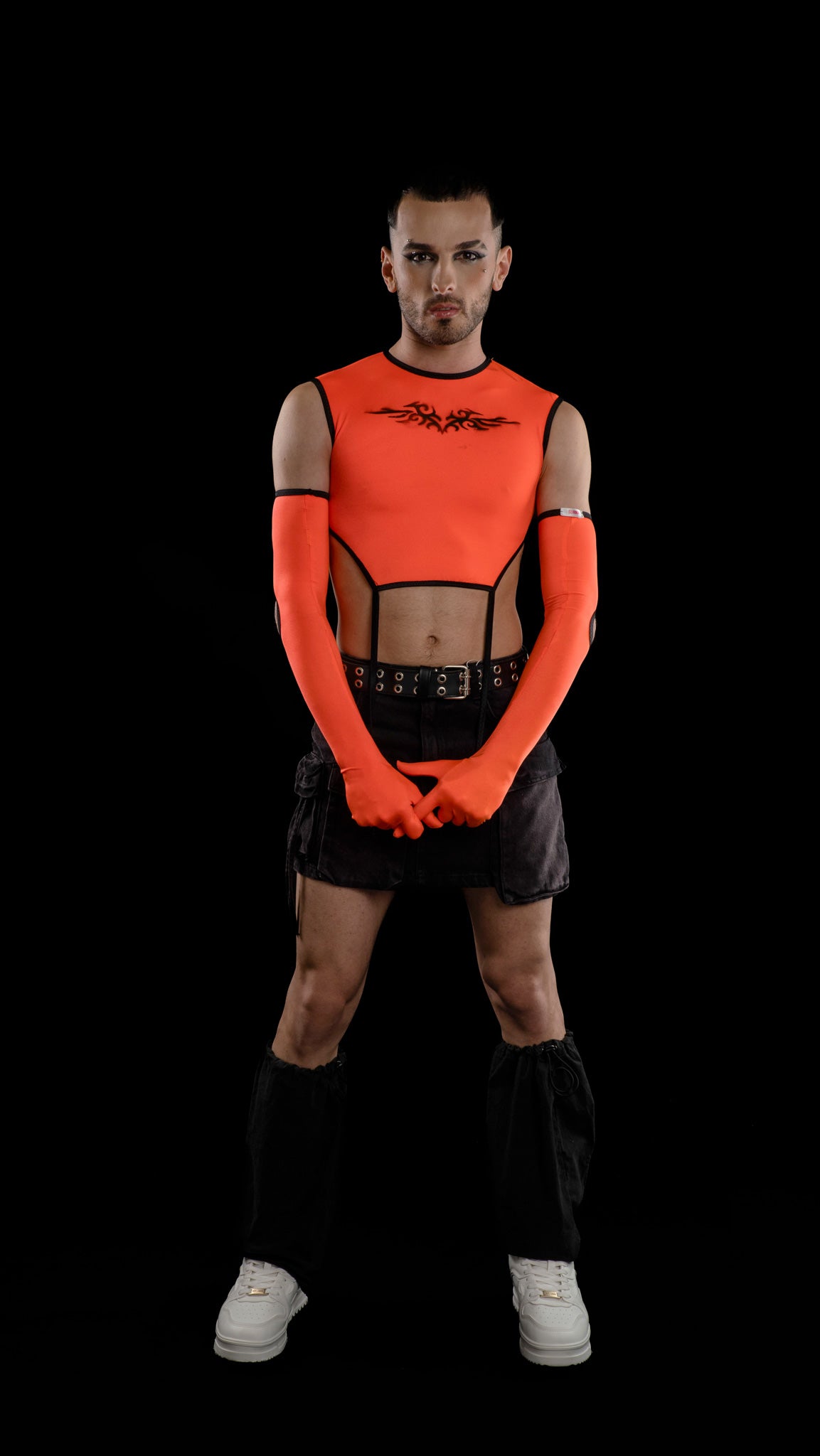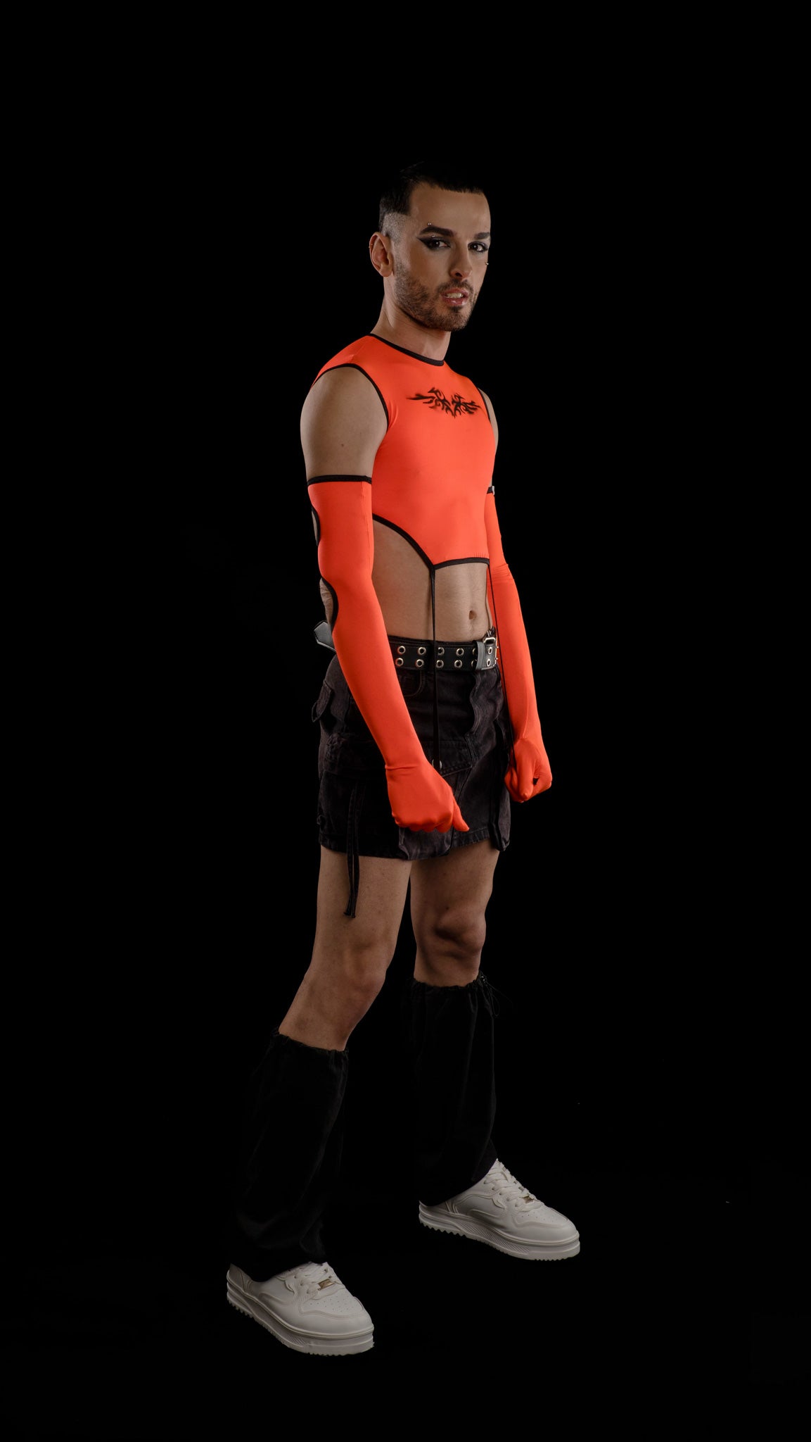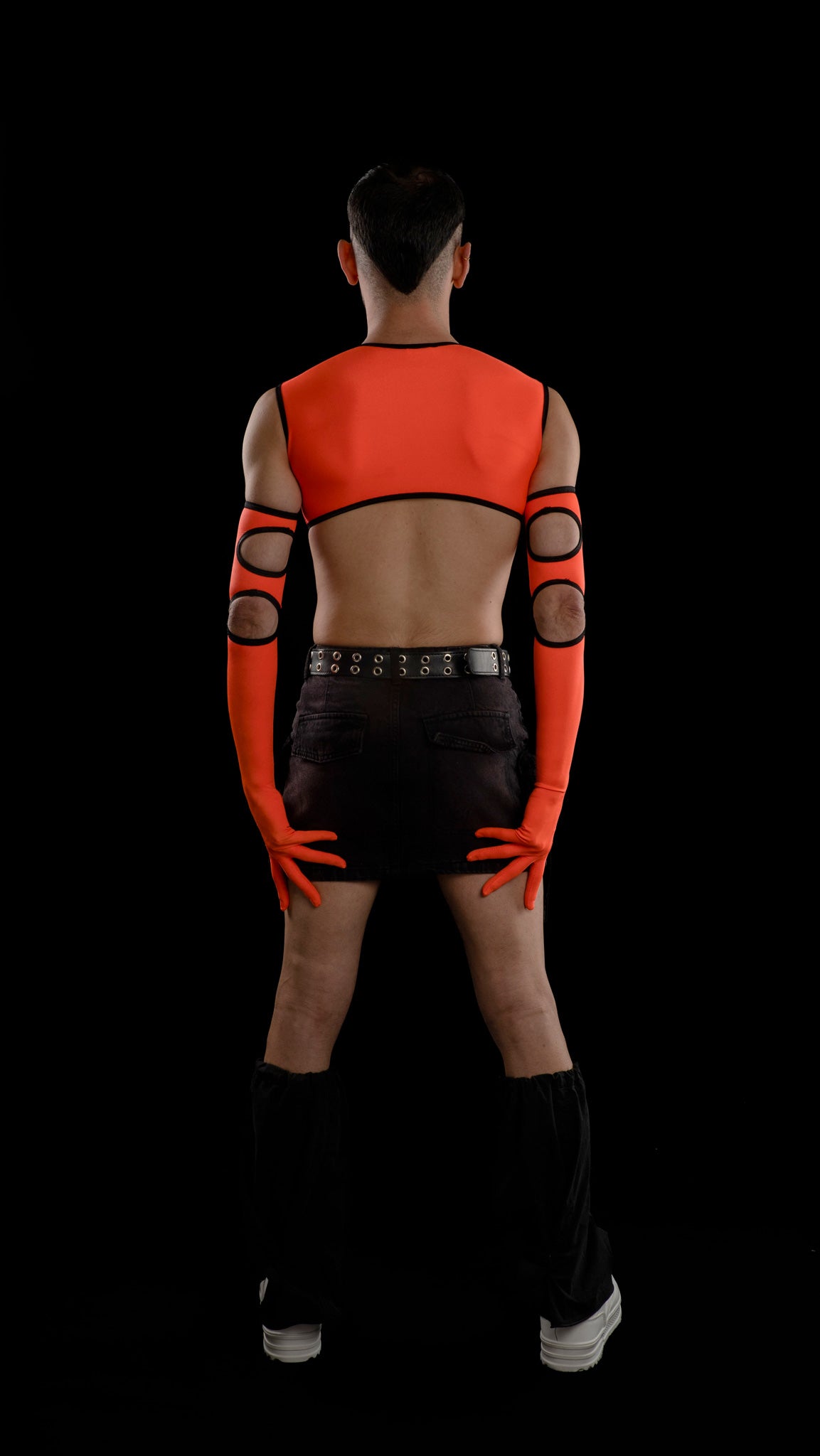Top y guantes en tejido de lycra neon. Guantes con corte cut out duplicado. Top desmangado con estampación tipo stencil con aerógrafo.