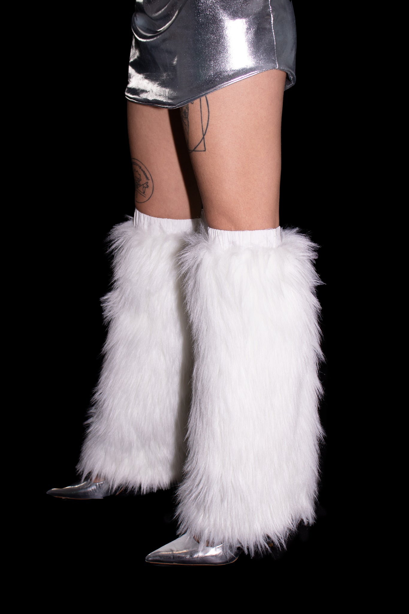 Pitkät tekoturkisjalat, valkoiset. Joustava polvituki.