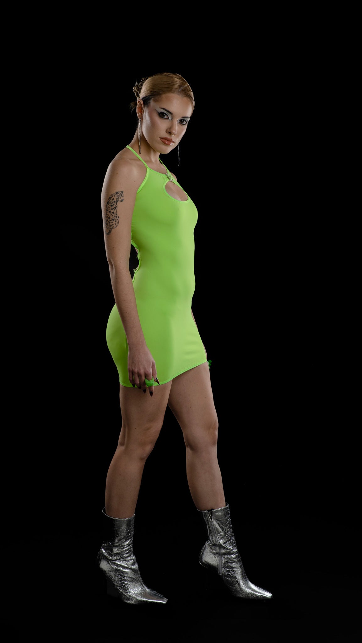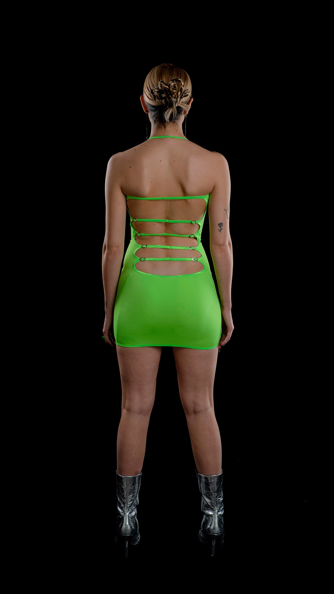Vestido mini de lycra con cut out en escote y broche con cristales. Cuello halter, escote en espalda con tiras horizontales.