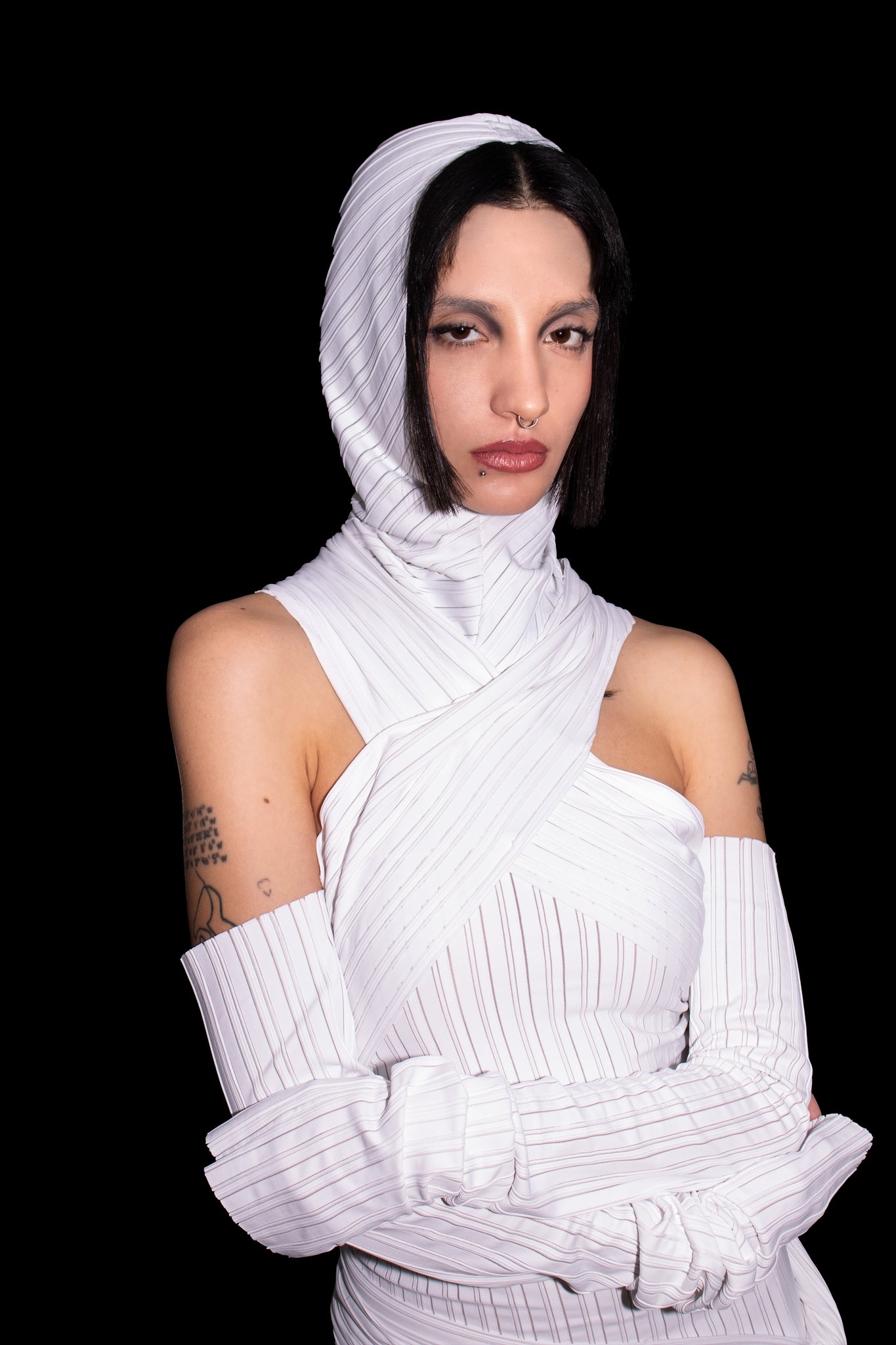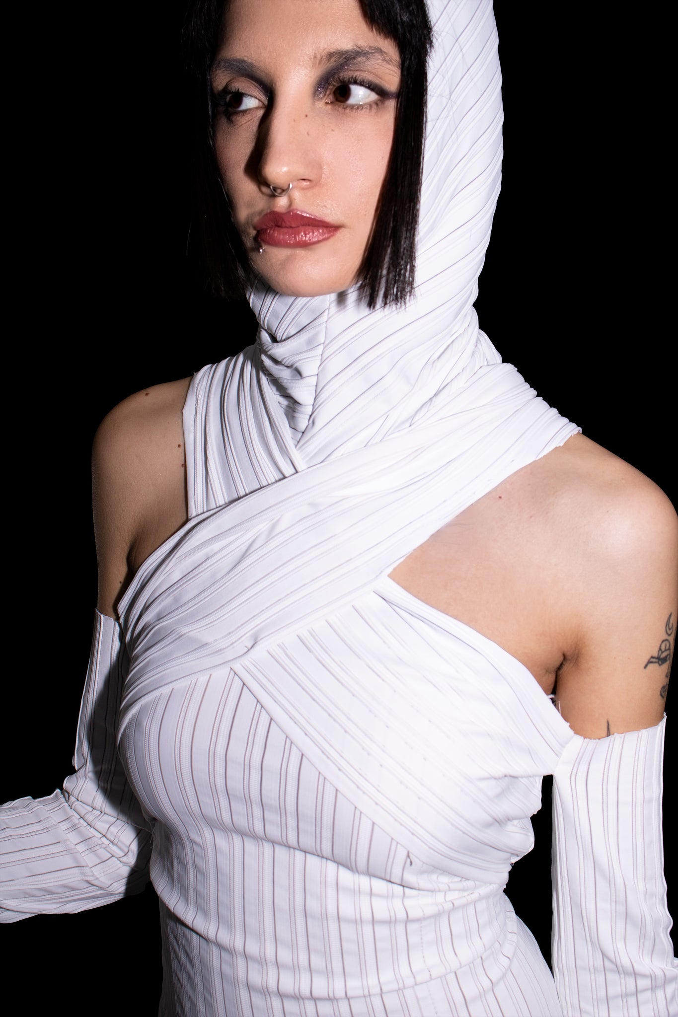 Vestido Cibeles en lycra blanca. Compuesto de 3 piezas: vestido base, manga con capucha y sobrefalda. Vestido tipo multiposición.