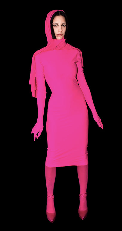 Vestido Oeste. Tejido elástico midi,  manga con guante incorporado. Cuello cisne y escote en espalda dividido en dos esferas.