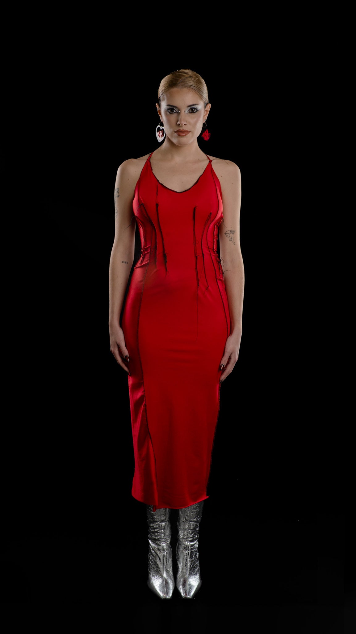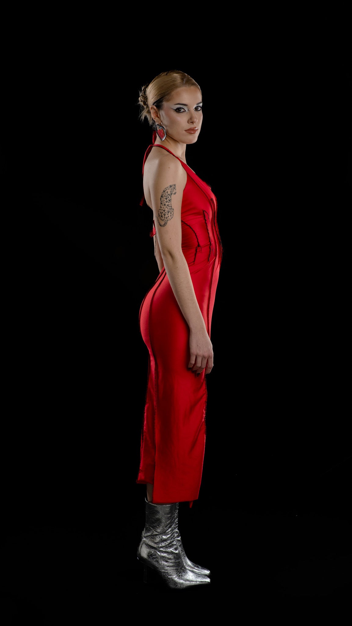 Vestido midi en lycra. Detalles con overlock, escote en espalda, cuello halter.