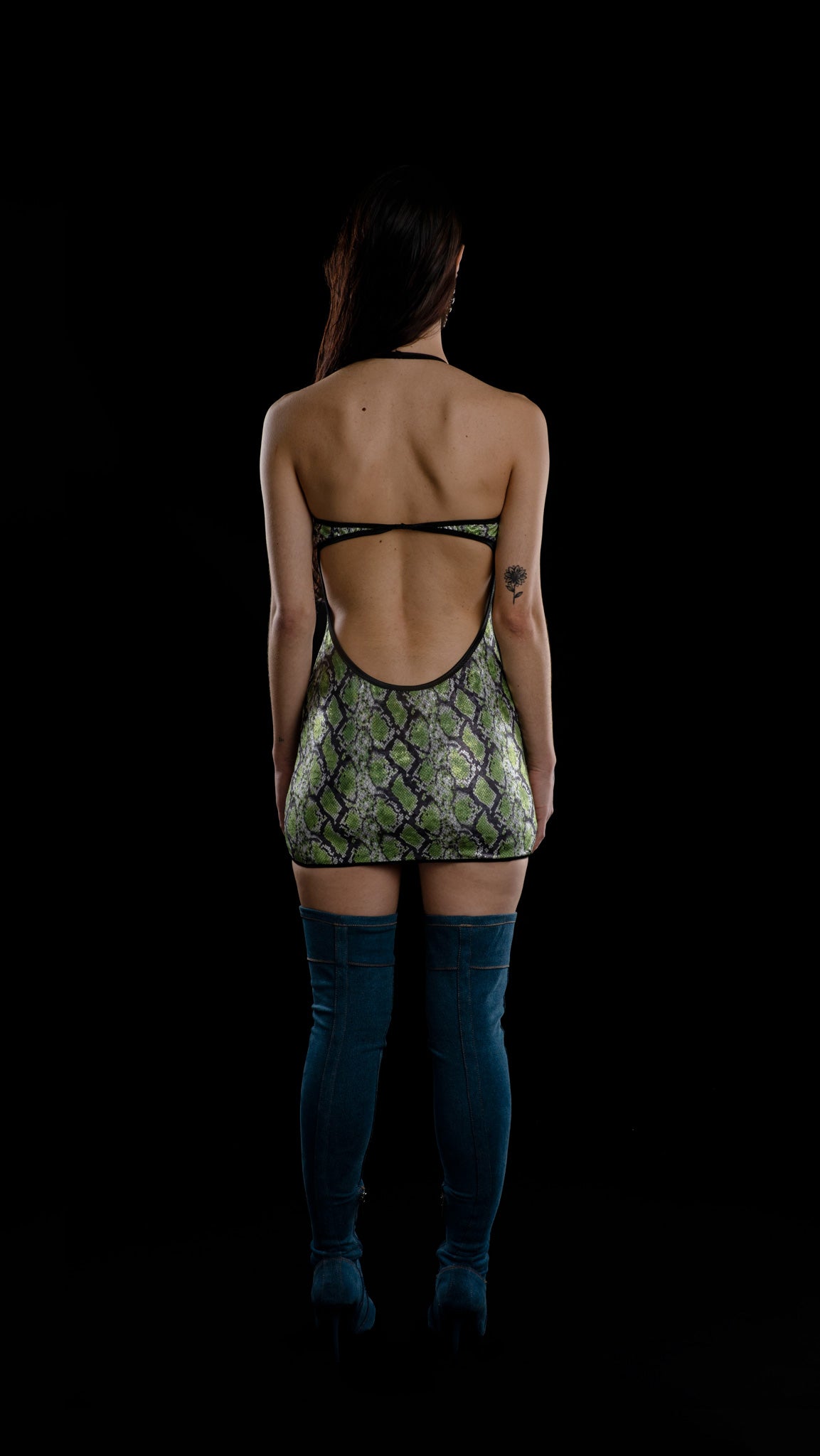 Vestdo mini en tejido elástico, metalizado y animal print de estampado serpiente. Corte tipo cut out en abdomen y escote amplio en espalda. Cuello halter.